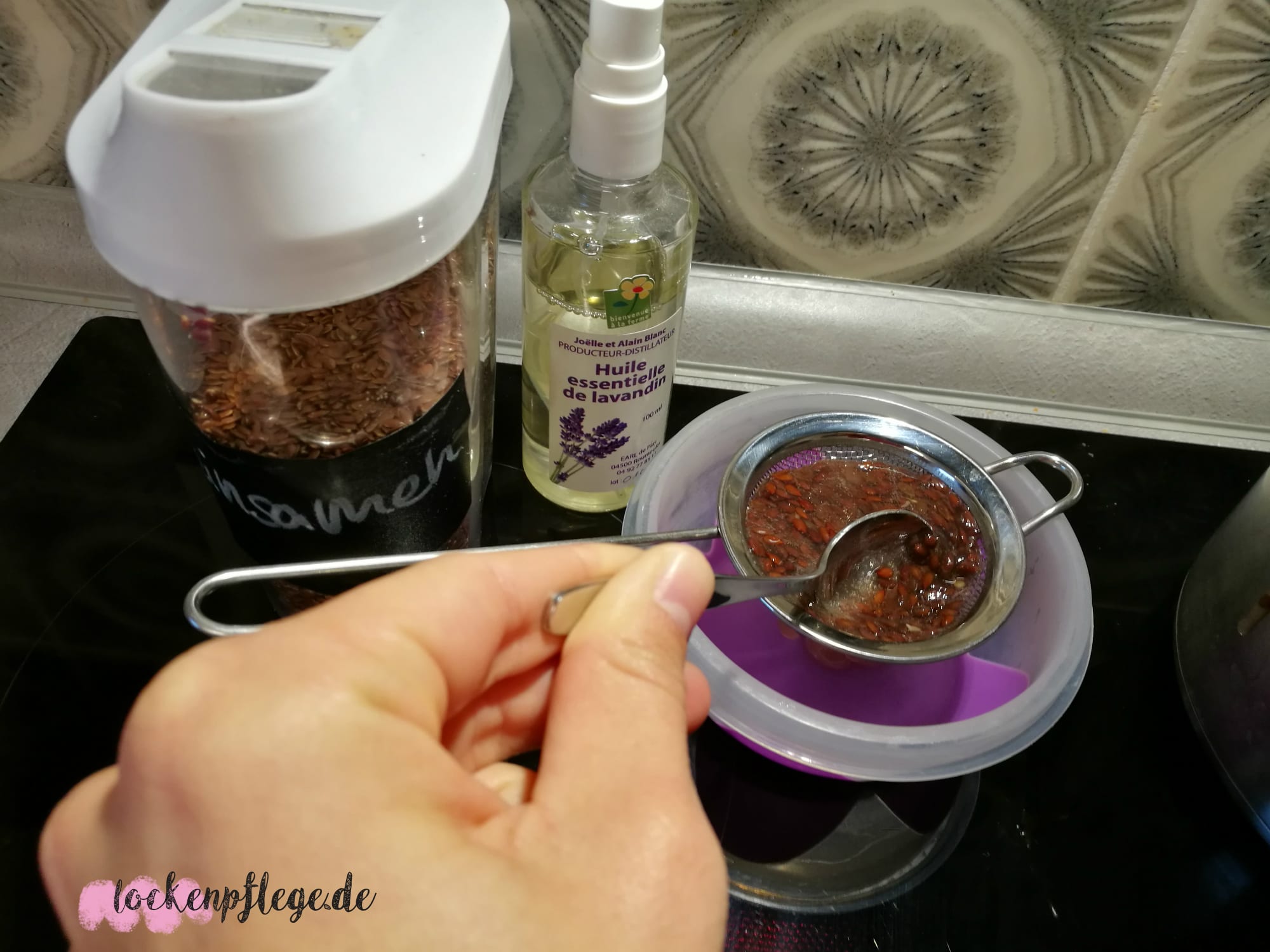Die gekochten Leinsamen schnell durch ein Sieb geben und bei Bedarf mit einem Tropfen ätherischem Öl verfeinern