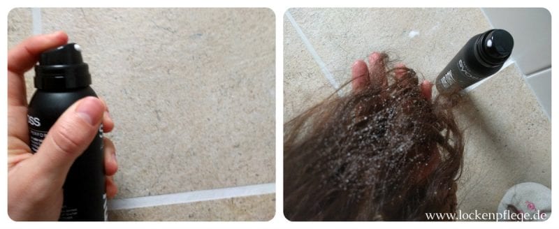 Die Flasche und der Sprühkopf des Syoss-Produkts sind eine Mischung aus Haarspray und Schaumfestiger. Und ebenso der Inhalt der Flasche. Wenn man den Sprühknopf betätigt, kommen ganz viele kleine weiße Schaumflöckchen heraus. Ein großer Teil bleibt allerdings auch an der Öffnung hängen. Um die Schaumflöckchen zu verteilen, muss man nun genau wie bei einem Lockenschaum die Haare kneten.